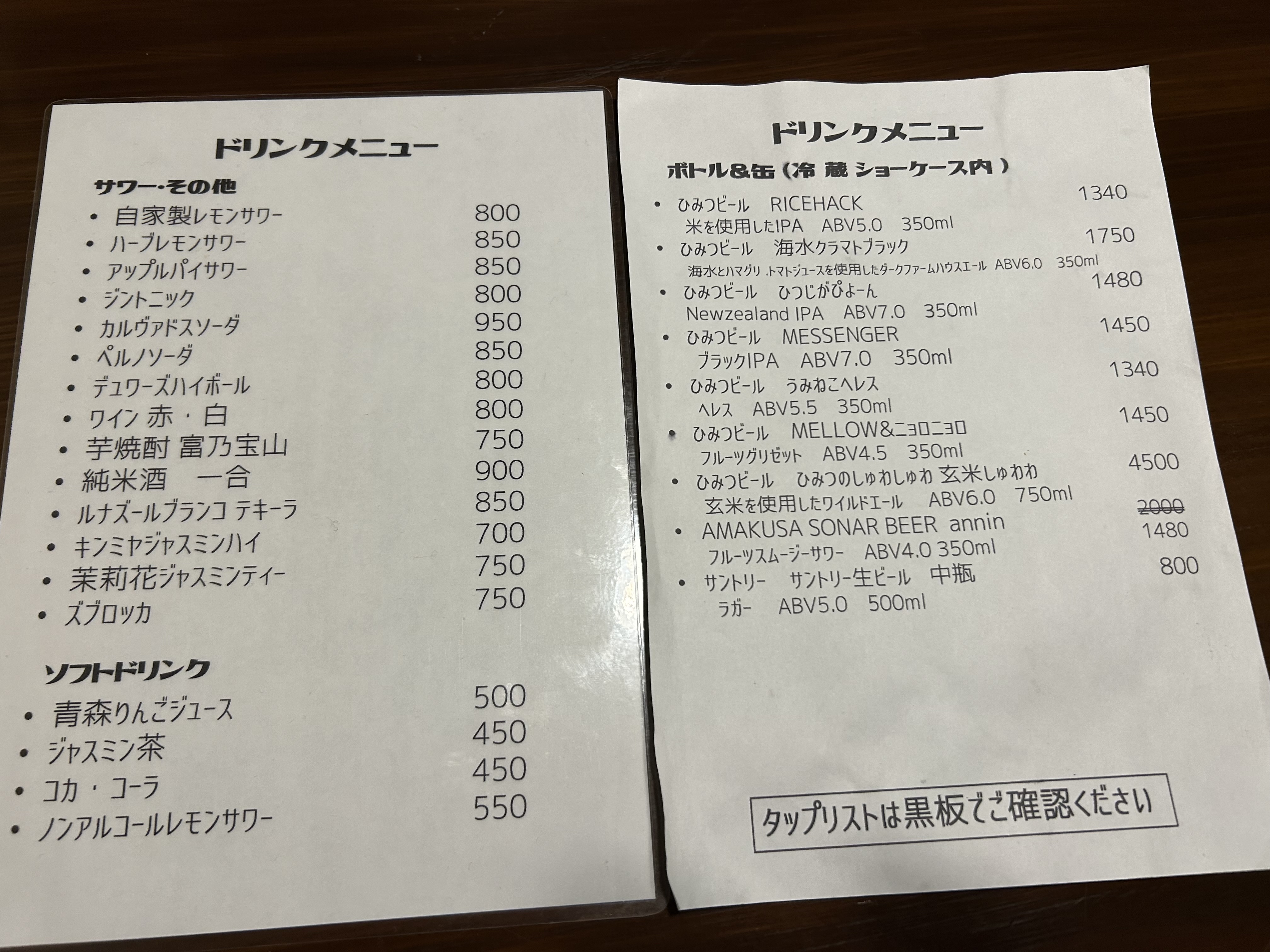 ドリンクメニュー。