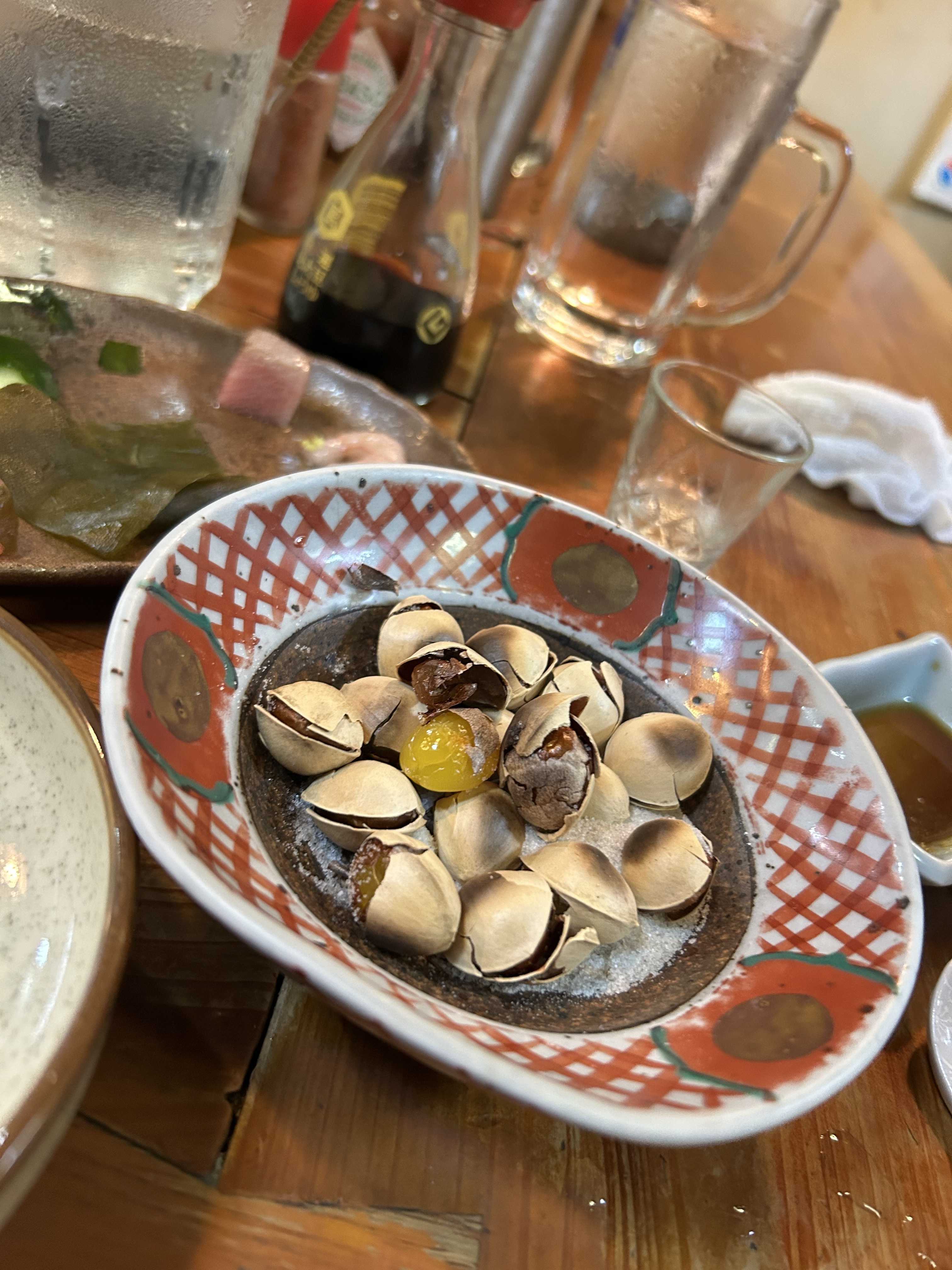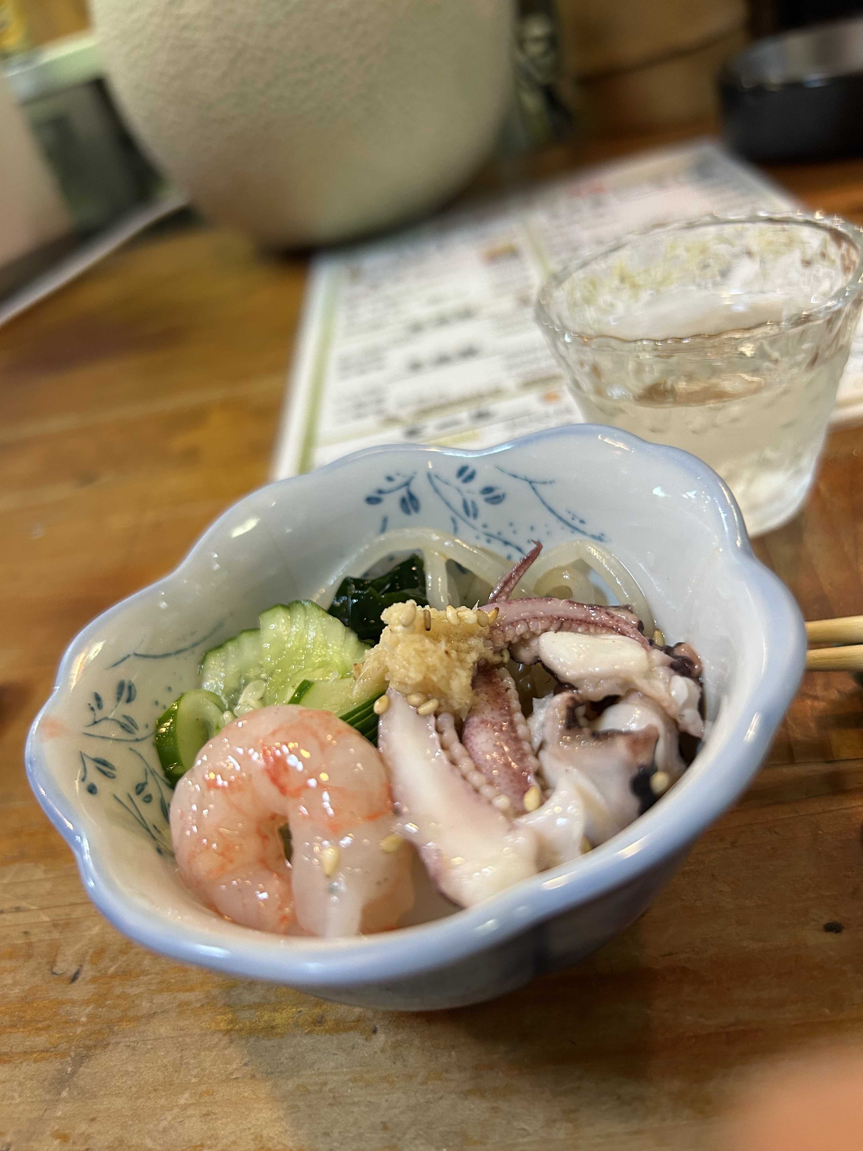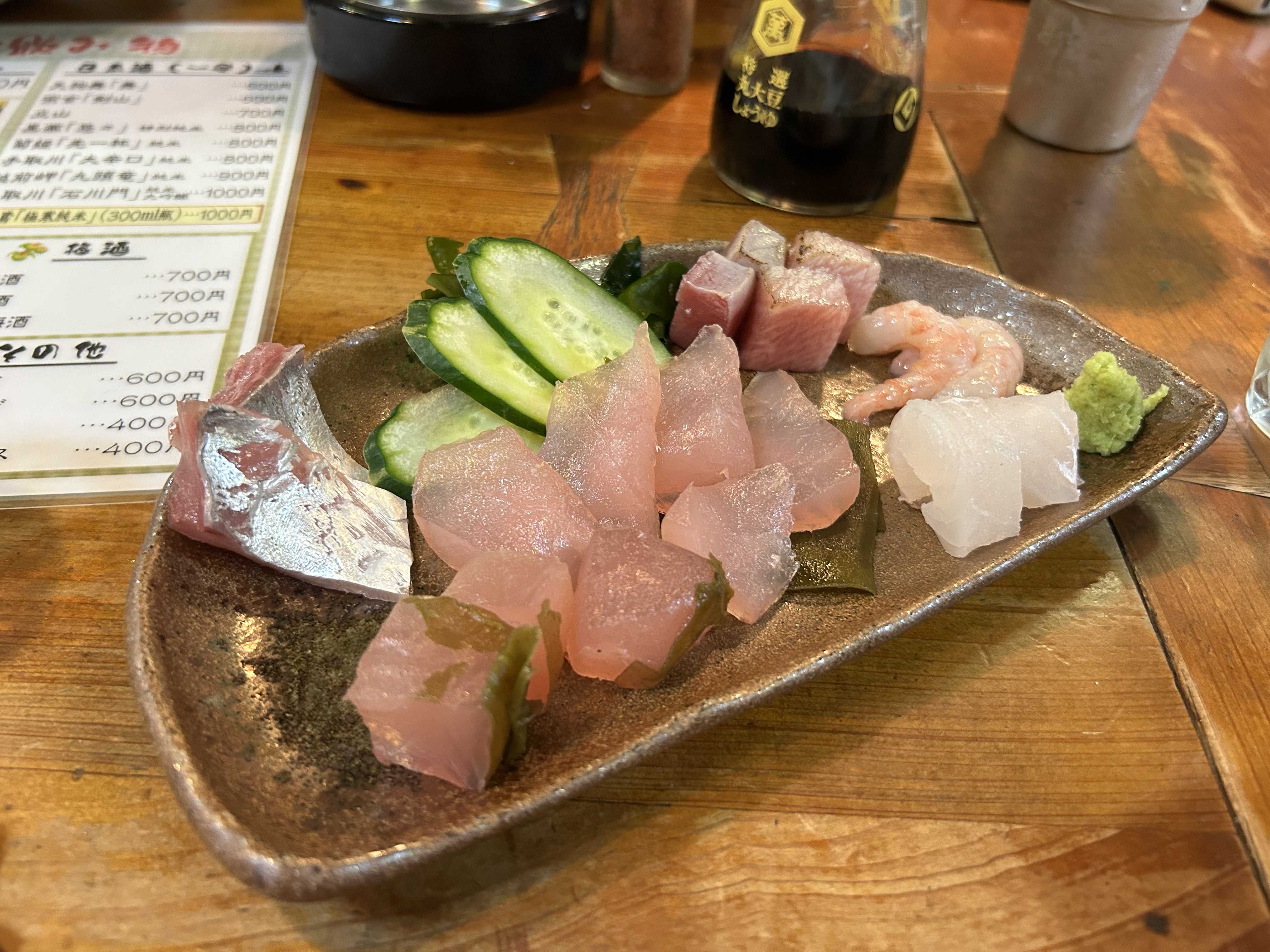かじき昆布じめを注文したら、なぜかアジ、マグロ炙り、甘えび、ヒラメも付いてきた。