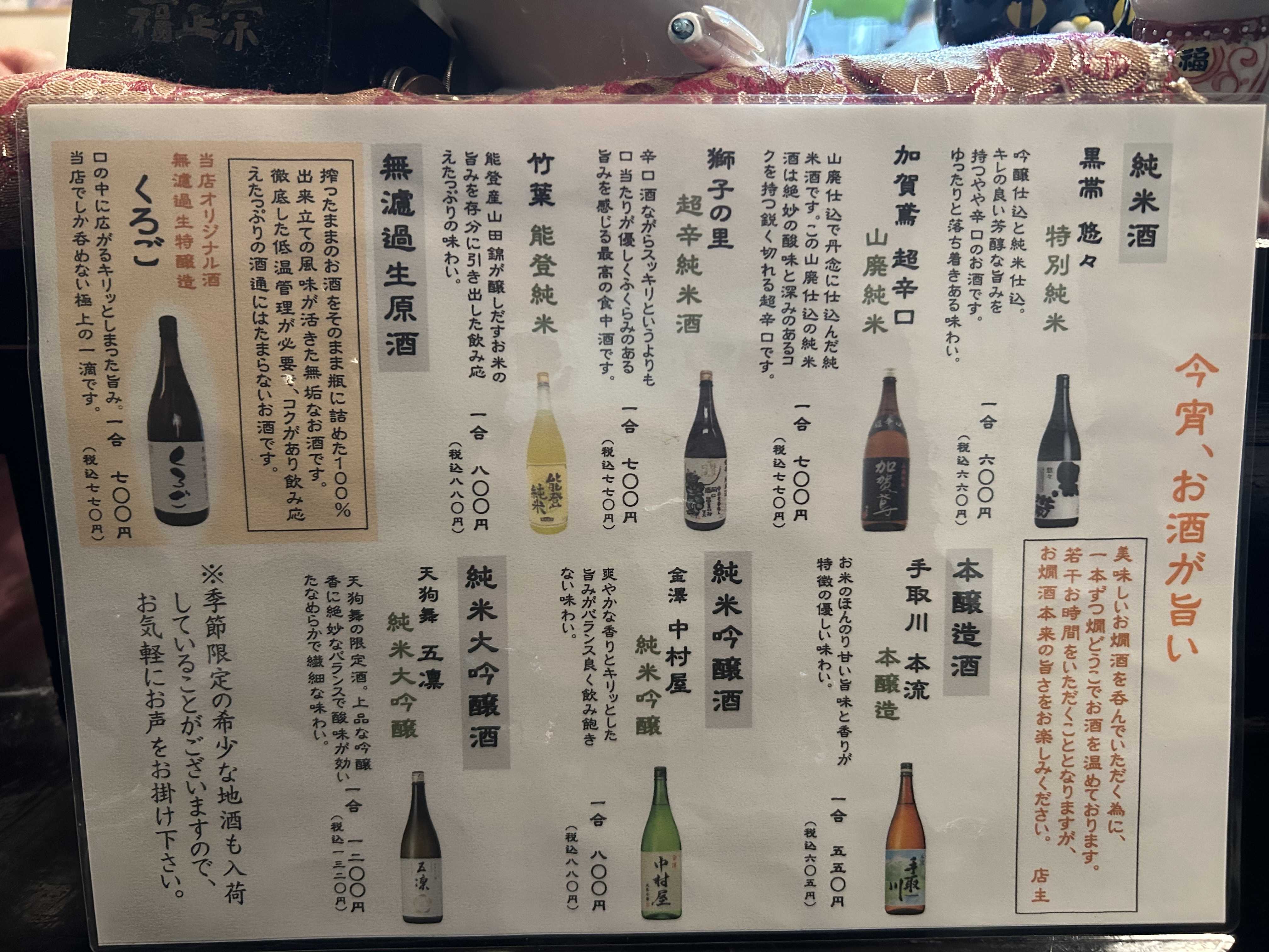 日本酒は石川県のものが並ぶ。