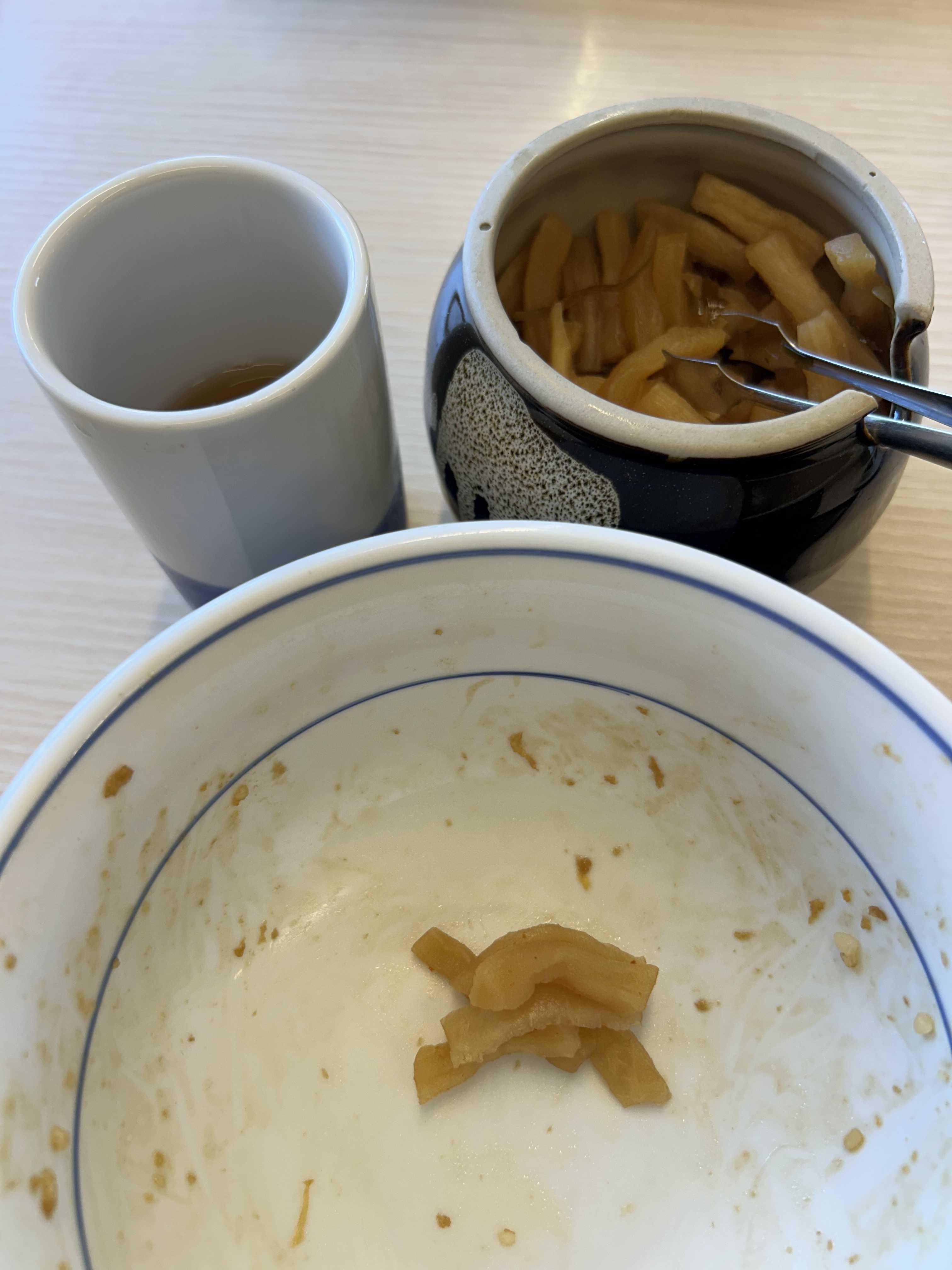 食後はピリ辛に漬けてある大根と冷たい麦茶で口直し。