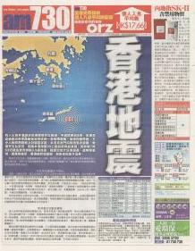地震が無いといわれる香港で、昨晩、地震が発生しました!!まず大地が揺れるといことが無い香港では、新聞やテレビでトップニュースとなる大騒ぎです!この衝撃的な見出しに、驚かれた方も多いと思いますし、家族や友人の安否が心配になった方もいるかも知れません。まさか…こんな事が…とりあえず、昨晩の地震状況をお知らせしましょう。14日午後7時55分、香港の東南36kmに位置するダンガン島を震源とするマグニチュード3.5の地震が数秒間ほど香港でも観測されたということです。?????????マグニチュード3.5の位置付けは「微小地震(あまり揺れを感じない)」ですし、観測時間は、ほんの5秒とのこと…らしい…です…と言うことは…オフィスで残業かしているか?夕食後に家のソファでくつろいでいる人くらいしか地震に気付かなかった…日本であれば報道すらされないレベルだった…と言うことですね。度重なる地震に慣れている日本人にとっては、地震とすら思わないレベルでしょう。でも、新聞では「近年大激烈」と見出しをつけてますし、生まれて初めて地震に遭遇した人々は、興奮気味でインタビューに答えていました(笑)香港気象庁に地震計が設置された1972年から現在まで、51回の有感地震が観測されているそうです。つまり、1年に1回ほど地震があるかないか?というレベルなんですね。油断してはいけませんが、まず香港では「地震が存在しない」と断言しちゃっていいと思います。私は、その時間、接待で客先とお酒を飲んでました。別な意味で揺れていて、貴重な地震を自覚することが出来ませんでした(笑)