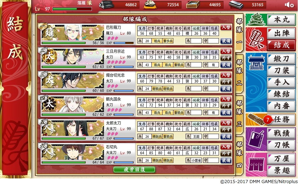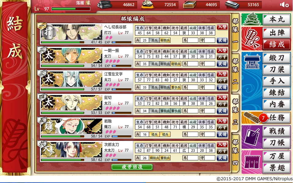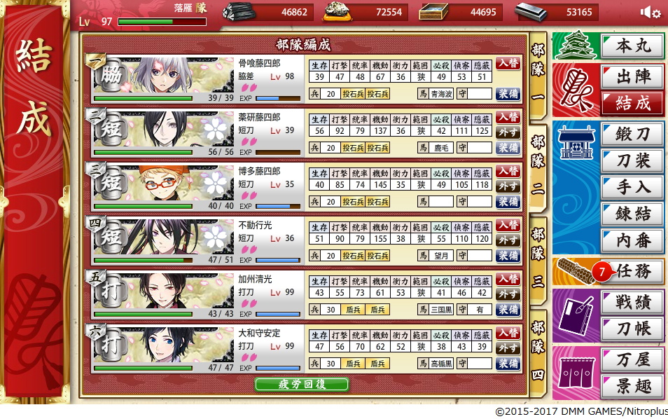 ウチには極めた子は短刀3人、脇差1人しかいないので、1部隊だけで勝ち上がるのは不可能。