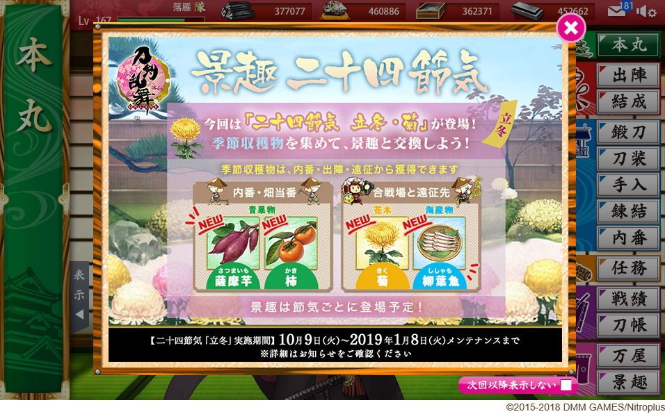 薩摩芋と柿が内番の畑でしか採れないからなあ。