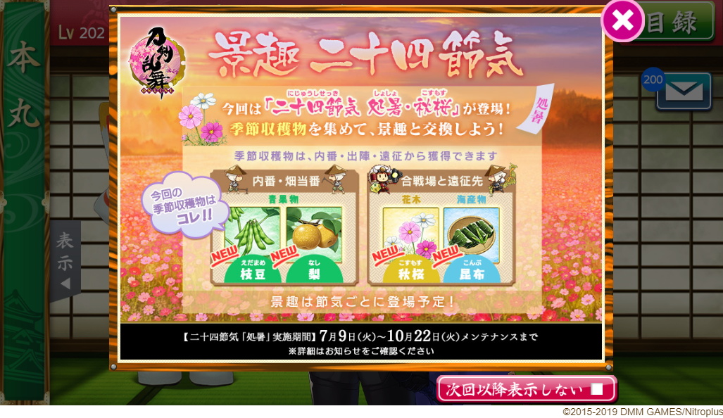 集めるものは畑の収穫物が枝豆と梨、遠征と出陣で秋桜と昆布です。