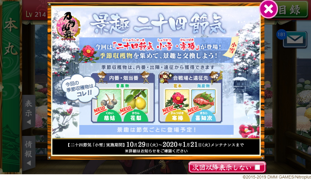10/29から配布の始まった景趣、二十四節気 小雪・寒椿を手に入れました。