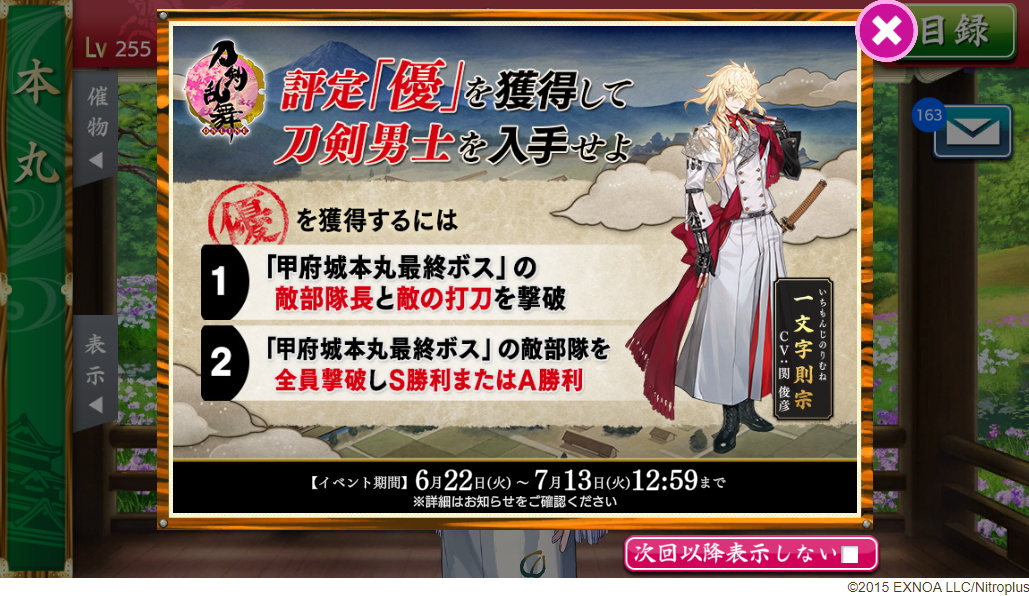 6/22~7/13で加州くんの特命調査、慶応甲府が2回目の開催です。