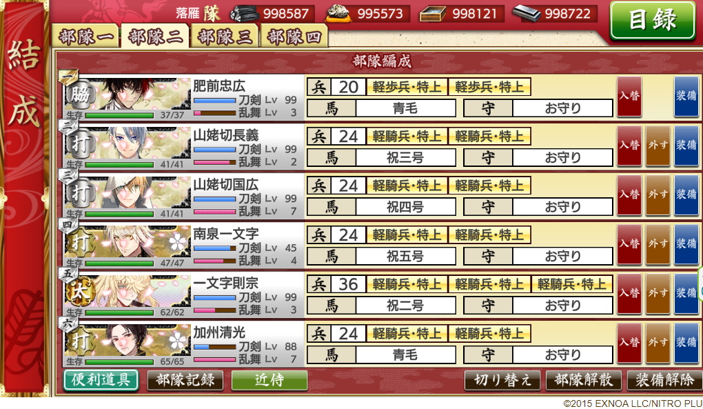 弱い子でもいけるので、最初の部隊編成を肥前、長義、山姥切国広、南泉、陸奥、亀甲。