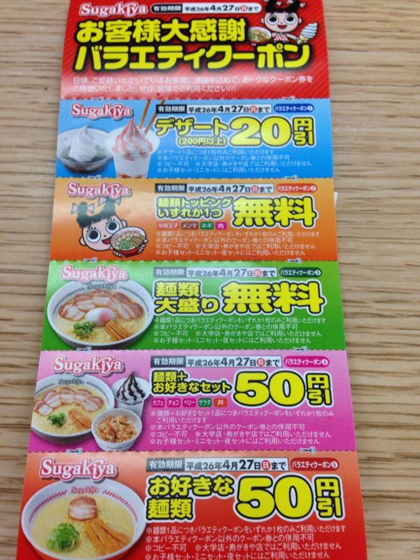 4月8日分 書いているのは4月12日 1日抜けると気持ち悪い(爆) 心身共 目まぐるしく忙しく ウツ気味 12日感想( 苦しかった … ) 増税後から使える 寿がきやクーポン券 ¥50円オフ 使用 ¥300になった ラーメンを食べりゃ ¥250 前価格より ¥40お得 不思議だゎ… 頼んだは 玉子入り¥350 って チマチマし過ぎ セコイ計算するも TVショッピングで衝動買いしている 私はおかしい(爆)