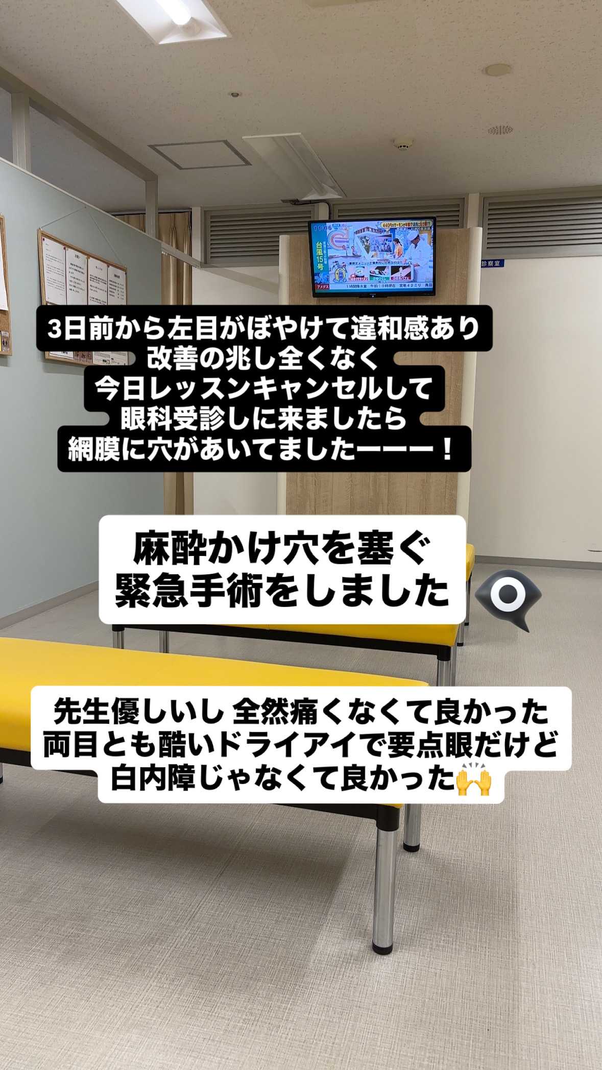 9月6日(☀️)午前6時半起床 慌ただしい1週間でした常に 誰かかれかおかしい我が家 昨日は私の番でした以前 年下のバレエ教師から こちらの眼科好評と聞いており私の主治医も通院してると聞き来院しました昨日は台風の影響か患者さんが少なくスムーズ初診でドキドキの私でしたが 看護師さんの明るく優しい対応と医師の 迅速な痛みのない検査 丁寧な説明網膜に穴があいており 放置すると網膜剥離になります原因は……年かな? なる人とならない人がいますレーザーを当て開いた穴を焼いて塞ぐ手術をします大きい手術しかした事がないので 速お願いしました 目の手術は初めてでした(これからあるんだろうけど)先生上手過ぎて感動しましたꉂ🤣w𐤔瞳孔拡く薬➕麻酔薬でボヤけた左目 お会計に進みましたこちら支払いは現金のみ 知ってたら用意したのに財布の中は13000円 「お金が無いので引き出してきましょうか?」に「次回でも大丈夫ですよー」と言われましたが千円残して 残りを支払いました🤪看護師より術後の注意 「今日はお酒控えてくださいね」聞く前に言われました 酒臭かったか…でもラッキー🍀 金曜日のアレから解放です定時退社 休肝日も出来た昨日でした人生 いつ 何かあるか 分かりません 穏やかとは無縁なのかなー(笑)今日は予定通り行くはず 仲良しKちゃんとランチして美容院です🍀