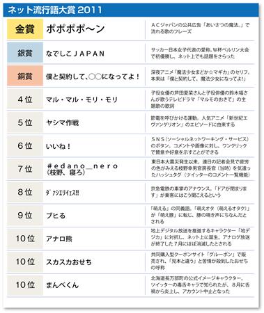 2011ネット流行語大賞が発表された~最高賞の金賞は「ポポポポ~ン」で、東日本大震災後に放送されたCMの言葉がネットでも頻繁に行き交ったことを示しました。銀賞は「なでしこJAPAN」。大きな悲しみと励ましで、様々な思いが湧いてきました.....出典:産経ニュース