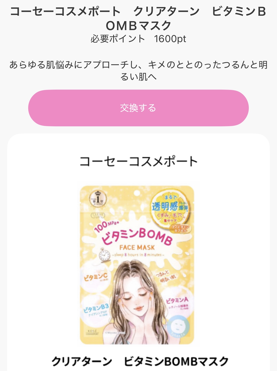 ビューティーウォークで初めて商品交換してみました。今春のコスメ交換半額キャンペーン中でいつもの半分のポイントで交換できます。(一部商品除く。)前から気になっていたクリアターンのビタミンBOMBマスクとロムアンドのグラスティングカラーグロスと交換。1ヶ月後くらいに届くみたいなので楽しみです♪2022年12月から始めて、約11,000ポイント貯まりました。歩くだけでコスメと交換できるのでコスメ好きにはおすすめのアプリです。招待コードよかったら使ってください。ZnKS82G4