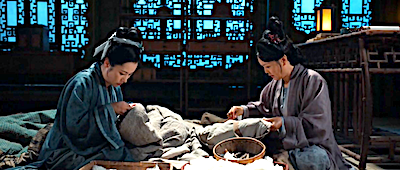 夏金娥の隣の部屋では大夫人・朱盈貞(シュエイテイ)と二夫人・斉蕙蘭(サイケイラン)が夫の綿入れを作っていた。