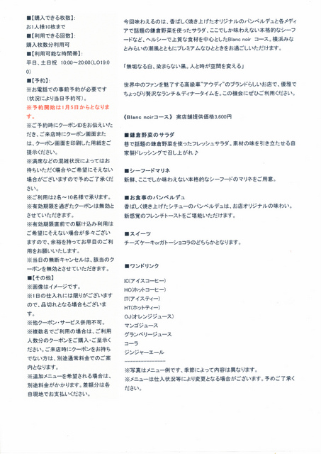 1月15日正午に、「Audi みなとみらい」に併設する「Audi Cafe by blanc noir(アウディ カフェ バイ ブラン ノイル)」に入店致しました。店内には老紳士が1人お食事中でした。私達は最も奥の席へと案内されました。「Audi Cafe by blanc noir」のRaCoupon広告抜粋今回もRaCoupon を利用致しました。新年会と1月生まれのKさんと私の誕生日祝いを兼ねたお食事会でした。≪Blanc noirコース≫を提供された順にご紹介致しましょう!(写真撮影の許可は事前に頂きました。)白ワイン:700円別料金■シーフードマリネ小皿に取り分けて頂きました。■鎌倉野菜のサラダオレンジ色のズッキーニなど入った、見るからに新鮮な野菜サラダでした。両側のスプーン・ナイフ・フォークはブラックで重みがあり、雰囲気に合わせたモダンなデザインでした。(位置は写真を撮るために適当に置いたものです。)テーブル装飾用のモダンなトーチ■お食事のパンペルデュ香ばしく焼き上げたシチューのパンペルデュ(新感覚のフレンチトースト)、シチューと共に味わう甘くはないパンベルデュは、初めての食感でした。■ワンドリンクグランベリージュース:Kさんと私の注文マンゴージュース:Mさんの注文■スイーツガトーショコラ:Mさんの注文チーズケーキ:Kさんと私の注文このチーズケーキは中々味わえない絶品のお味でした。この実店舗提供価格3600円のコースを半額の1800円(1名)にて頂けました。新鮮で高級な材料を使っていることの分かるお品の良いお味のお料理でした。唯、ウエイトレスさんがまだ不慣れなのか説明が不十分で、ナイフやフォークを料理の度に変えるのか、同じものを使い続けるのか分かりませんでした。もし使い続けるのでしたら、汚れたものをテーブルに直接置くのは気になりますので、スプーン置きのようなものが欲しいと感じました。3人揃っての記念写真お天気が雨のせいもあってほぼ貸切状態で、130分間ゆったりとお食事と談笑を楽しむことができ、3人とも大いに満足致しました。
