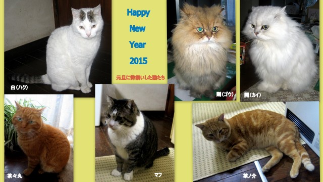 元旦の朝、珍しく6匹のペットたちが揃いました。元日のペットたち剛と開 9歳白 4歳マフ 推定10歳以上飼い猫になりたがっている野良の茶ノ介 推定3歳飼い猫になりたがっている野良の茶々丸 推定1歳朝食タイム一斉に食事です。私に愛らしい仕草で癒しを与えてくれる、可愛いペットたちです。