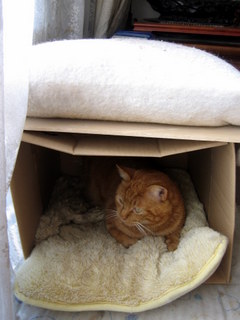 私の誕生日の18日に晩御飯を食べに来た野良の茶々丸が、この日から野外へ帰らず、家猫の仲間入りをしました。剛と開愛用のベッドを自分の居場所と決めたようです。チャッカリ居座る茶々丸安心しきって眠る茶々丸これまでは遠慮がちに餌を貰っていた茶々丸ですが、今や私の側まで来て堂々と要求します。ベッドを譲ってしまった剛と開は2階へ移動、布団の上で寝る開私の羽毛布団の上、湯たんぽの入った足元がお気に入りの寝場所です。ダンボールベッドで寝る剛私の枕元に作ってあるダンボールベッドがお気に入りです。お転婆娘の白は、白のベッドは高い所衣類を入れて積んである段ボール箱の一番上を、自分で好みのベッドにしてしまいました。白は身軽で高い所を好みます。一番寒がりのマフは、マフのお気に入りの寝場所ムートンの敷いてあるキッチンの私の椅子がお気に入りです。マフの快適な寝場所ファンヒーターの熱の籠もるテーブルの下は、快適な寝場所です。