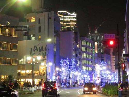 12月9日の午後7時10分頃、タクシーで「青の洞窟」会場となる道路の入り口側に下車する。渋谷のメインストリート直前に通ってきたストリートも、青のイルミネーションで装飾を統一している。「青の洞窟」イルミネーションのスタート地点右手「国立代々木競技場」、左手「NHK放送センター」に挟まれた道路。人込みで混雑してくる。親子連れもいるが若いカップルが多い・半分の地点からは、地面に特殊シートが敷かれていて、水面の如く対照的なイルミネーションを映し出している。80代後半と70代後半の最高齢カップル?人込みの中で振り返ると静かに進む人の流れ終 点念願叶って「青の洞窟」のイルミネーションを、若い人たちに混じって約30分間、共に観賞できた幸せに浸る。*=*=*=*=*=*=*=*=*日中、会場を下検分に訪れる。「青の洞窟」会場入り口付近右手「国立代々木競技場」、左手「NHK放送センター」に挟まれた道路が会場とのこと。街路樹に巻き付けられた配線映像パネル終点地点にあるお店で休憩