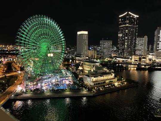 「全国旅行支援割引」の始まった10月11日から2日間で予算額を使い切った「かながわ旅割」を運良く利用することができ、10月19日(水)に「横浜ベイホテル東急」宿泊を楽しんで参りました。◎そのご報告を致しましょう!フロント午後4時少し前フロントにてチェックイン手続きをした後、「エグゼクティブツイン パークビュー」のお部屋1725室へ向かう。エントランス左手・クローゼット、右手・浴室洗面所。浴室洗面左手・シャワーブース右手・大きな浴槽ベッドTVその他テーブル&チェアー室内は40平米位あり、バルコニー付きでゆったりとしている。眺めは?みなとみらいの眺望(友人作成によるパノラマ写真)抜群の風景に、しばし見惚れる。少し休憩すると午後5時を過ぎている。「夕食はどうしようか?」ということになり、2人共「お腹が空いていない!」とのことで、軽く済ませることにする。● 近くのコンビニで購入した物エビスビールコーラサンドイッチカップラーメンお摘み(写し忘れる。)シャインマスカット(友人のお土産)お部屋での慎ましい夕食いつもと違って慎ましやかな夕食となりましたが、15分間毎に、5分間のショーを見せてくれる観覧車や、まばゆさを増してゆく夜景を眺めながら、午後6時頃より午後11時頃まで存分に語らいを楽しみました。みなとみらいの夜景(友人作成によるパノラマ写真)私の大好きなみなとみらいの夜景、いつ見ても魅せられる。