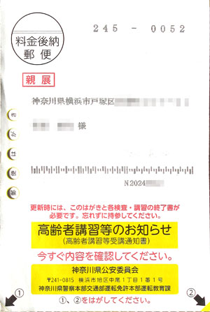 今年は予想だにしていなかった左手首の「橈骨遠位端複雑骨折」をするというハプニングがあり、手術後の5か月間のリハビリも終わろうとする6月下旬に、私自身は「運転を止めよう!」と決心し、新車のアクアも手放しておりました。ところが、私の最も親しい友人が、「アクアの新車を注文してあるから、車が届いたら一緒に運転して欲しい!」とのこと。何となく気が重かったにもかかわらずその願いを叶えるために、後期高齢者講習への私の挑戦が始まりました。8月19日に「高齢者講習等受講通知書」が届きました。表 面中 面10月に入ってから、「横浜自動車学校安全運転研修センター」での11月28日正午からの検査・講習の予約を致しました。◎11月28日(木)高齢者講習の当日11:50~ 受付開始 支払いを済ませる。認知機能検査料金高齢者講習(実車指導あり)料金12:00~ 認知機能検査今回からタブレットによる試験が行われ、合格点に達するとその時点でストップとなりその場で静かに待機することになる。全員の終了を待つ。13:00~ 実車指導私は実車指導班に入り、真っ先に実車指導を受ける。1月以降全くハンドルを握っておらず、内心とても緊張しておりましたが、意外や意外スムーズに運転を済ませることができ安堵する。運転しながら「私は運転が好きなのだ!」ということを実感する。14:30頃~ 視野検査視野は右眼と左眼を合わせた両眼視野角度が150度以上でないと運転に適さないとのこと。動体/夜間視力検査15:20 高齢者講習同等修了証明書取得認知機能検査結果通知書取得午後3時30分全ての行程を終え、無事免許更新時に必要な書類を携えて帰路に着く。