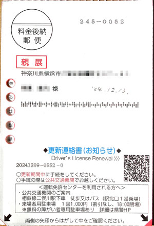 12月13日(金)神奈川県公安委員会より更新連絡書が届きました。表 面中 面裏 面12月25日(水)免許更新に「二俣川運転免許センター」に出かけました。◎持参した更新手続きに必要なもの運転免許証更新連絡書手数料(神奈川県収入証紙 高齢者2500円)高齢者講習終了証明書認知機能検査結果通知書高齢者講習等のお知らせ(葉書)当日は早起きして午前8時24分発「緑園都市」行きバスに乗車する。約20分後に「緑園都市」駅に到着する。相鉄線に乗り換え「二俣川」へ向かう。緑園都市駅ホーム8時53分発快速「横浜」行きに乗車する。2駅先の「二俣川」駅にて下車し、循環バスに乗り換え「運転免許センター」にて下車する。運転免許センターエントランス地元のバスに乗って出発してから、丁度1時間後に到着する。館内の指示に従って歩を進める。運転免許更新手続きの流れ申請書記入・暗証番号設定指示に従って機械を操作し、出てきた更新申請書と暗証番号表を手にする。更新申請書の印字された表面を確認し、裏面の質問にチェックを入れる。↓受付持参書類を提出、更新手数料を支払う。↓適正検査↓更新審査再び書類と免許証を提出、質問に答える。↓写真撮影↓更新免許証交付この間高齢者優先レーンが設けられてあり、スムーズに行程が進み、入館から約40分で更新免許証を手にすることができる。交付された更新免許証年内で最も気になっていた課題が無事終了して、ホッと致しました。*=*=*=*=*=*=*=*=*2024年も私のブログにお付き合い下さり、ありがとうございました。来年も宜しくお願い申し上げます。皆様には、どうぞ良いお正月をお迎え下さいませ。 ゴウトカイ