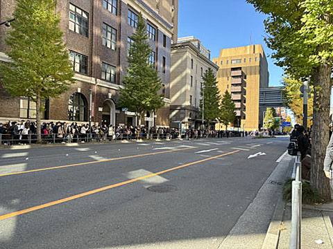 11月の最終土曜日の30日に友人と、約1年振りに山下公園通りへと向かいました。この日は横浜駅にてB1にある「みなとみらい線」へ乗り換え、「日本大通」駅にて下車して地上へと出ると、歩道という歩道が大勢の人で埋め尽くされておりました。何故こんなに人が集まっているのか分かりません!道路も封鎖されている所もあるとのこと。来慣れているはずの場所なのに、全くの方向音痴になる。封鎖が解除され、人々が動き出しました。「何があったのですか?」と近くの女性に尋ねると、「『横浜DeNAベイスターズ』の優勝パレードがあった。」とのことでした。この日の夕方のニュースでは、40万人以上の人出があったとのこと!納得の混雑でした。道行く人に山下公園方向を尋ね、人込みを搔き分け歩き出しました。山下公園通りに出ると、目の覚めるような美しい銀杏並木の黄葉が、目に飛び込んできました。快晴の空に一層映える黄葉!最高の美しさ!大変な人出!写真を撮り合っていると、通りがかりの女性が親切にも、ツーショット写真を撮って下さいました。良い記念写真ができました!感謝です!通りには、こんな標識ができていました。「日本の道100選」他の地方でも出会えるでしょうか?注意して観察するように致しましょう!