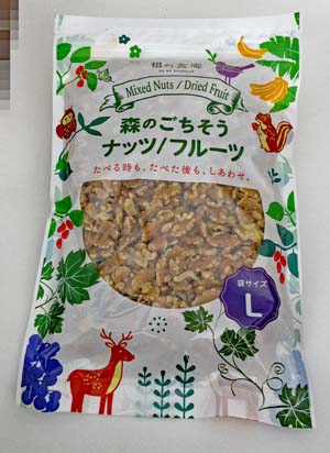 *クルミ森のごちそうナッツ/フルーツ剥きクルミ 700g天然サプリメントと呼ばれるほど、ヘルシーで栄養満点!くるみの5つの効果効能・睡眠の質の向上・不眠症の改善効果血中のメラトニンというホルモンが3倍に増える。メラトニンは体内時計を整え、夜になると自然な眠りへと誘う効果がある。・ダイエット・美肌効果ミネラルやビタミンが豊富。ビタミンB群は疲れにくい体づくりをサポートする。身体の組織を美しく保つ効能があるため、美肌効果が期待できる。・薄毛対策・美髪促進効果髪の毛を作るのに必要なたんぱく質、ビタミン、ミネラルも豊富であるため髪に必要な栄養を補給でき、しなやかな強い髪につながる。・アンチエイジング効果クルミには赤ワインを上回るポリフェノールが含まれており、細胞が酸化して錆びつくのを防いでくれる。・生活習慣病の予防効果くるみにはコレステロールや中性脂肪の値を下げる効果、血をサラサラにして高血圧や動脈硬化の心疾患を予防する効果も期待できる。くるみに含まれるオメガ3脂肪酸やビタミンEの働きによる。1日に理想的なくるみの摂取量は7粒(約28g)とのこと。(「ナッツと豆の・豆知識 arima me ブログ」より抜粋)私の食べ方の一つ生クルミを軽くローストし、カナディアンメープルをかけて頂く。*=*=*=*=*=*=*=*=*80歳に入った途端左手首骨折というハプニングに出会い、昨年1年間で体力の衰えを実感致しました。「この80歳代を少しでも元気に乗り切るためには?」「体の中から健康に!」と、考えるようになりました。そして自然に健康に良い食品との出会いが増えてきました。こうしてそれぞれの食品について効果効能を調べてみると、色々なことが分かり嬉しくなりました。「健康寿命100歳を目指して」今後も頑張りたいと思います。