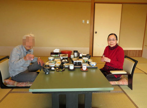 3月6日午後6時過ぎ「青山やまと」のラウンジでのチェックイン手続き時に、お部屋のランクアップと、食事は食事処からお部屋食に変えて下さったとのことを伝えられる。手続きを終えると6:15を過ぎている。夕食時間を6:30として番頭さんが5階のお部屋へと案内して下さる。「夢の逢(ゆめのえ)」私達の部屋玄 関納戸(お布団入れ)その向かいには小キッチンこの向かいにトイレがある。さらに奥に、洗面所洗面所右手にお風呂場年代物の檜風呂2シンクの洗面台12.5畳の広い和室ゆかた左男性用、右自身で選んだ女性用広 縁外はすでに真っ暗となっている。明かりがちらほらと見える。華やかな横浜の「みなとみらい21の夜景」を見慣れている身には、どうしても侘しさを感じてしまう。早速浴衣に着替えてお食事を待つ。
