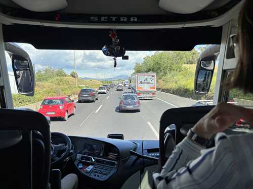 〈日程2日目〉2025年5月9日(金)ドバイ空港にて乗り換えドバイ空港→ローマドバイ発 : 9:10ローマ着 : 13:25【ローマ泊】乗り換え便のチケットパスポートとチケットを所持し、入場を待つ乗客長蛇の列になる。エミレーツ航空機機内は満席の賑わい、61列のF、Gに着席する。液晶画面で離陸時の同時中継画面を見られる。飛行ルート世界の昼夜帯を示す画面機内食サービス昼食中13:25 約6時間15分の飛行の後、ローマのレオナルド・ダビンチ空港に着陸する。預けたスーツケースの回収やっとTさんのスーツケースが見つかる。全員揃うと、ここから専用車で宿泊ホテルへと移動する。