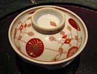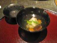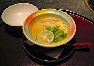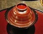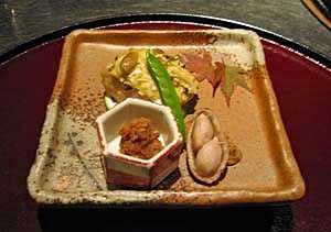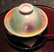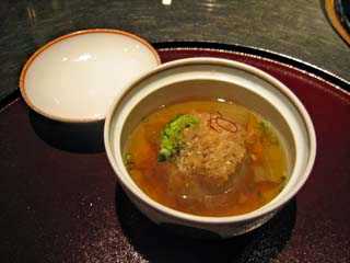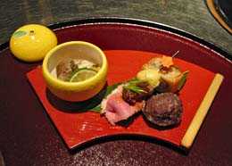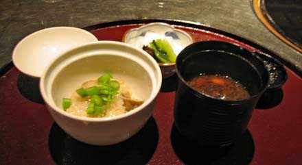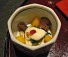 米茄子鴫炊き 鱶鰭餡掛け 刻み葱 糸賀喜 糸唐辛子