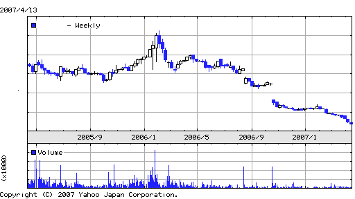 上方修正したワッツや創通の株価を見ていると新興の弱さが実感できます。バンダイビジュアルの決算が出ましたが、今期の見通しが減益となっています。以下、決算短信より抜粋:売上高は350億円(前年同期比8.7%増)、経常利益は48億円(前年同期比2.7%減)、当期純利益は26億50百万円(前年同期比4.5%減)となる見込であります。売上高増加に対して、経常利益及び当期純利益が微減の予想となっておりますが、これは当連結会計年度で業績に大きく貢献した音楽事業の予想を平常ベースで見込んだこと、新たに連結対象となる子会社3社は、中間期においては事業基盤構築段階であり、通期で損益分岐点を若干超えた利益を見込んでいること等によるものです。この地合いだと安く買える機会があるかもしれませんね。平成19年2月期決算短信(連結)平成19年2月期決算<参考資料>