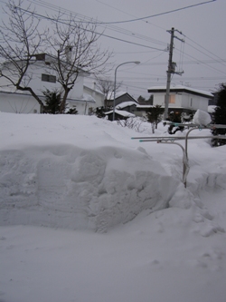 年前は少なかった雪も、今日の我が家の前の状態は画像のとおり。除雪の雪のせいもありますが、物干しと同じ高さになったことはいまだかってありません。やはり帳尻は最後にあわすものなんですね。