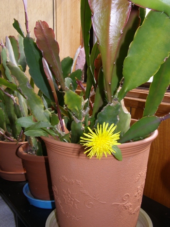 2回の部屋に避寒している孔雀サボテン。夏には外に出しているのですが、そのときにタンポポの種が飛んできていたみたいです。