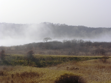 白糠側から降りていく途中でした。海霧が沼の水面を奥へ奥へと渡っていました。気温は、10度くらいでしたでしょうか。昼なのに、幻想的なシーンでした。