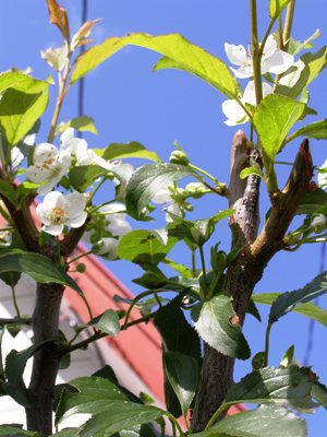 近くに住む友人の K さんから「庭のプラムに花が咲いたわ」と連絡があった。カメラ片手に訪れてみると、白い可憐な花が10数輪咲いていました。