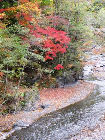 左の画像は、トムラウシ温泉への手前9キロメートルのところにある「曙橋」からのトムラウシ川上流河岸の紅葉です。