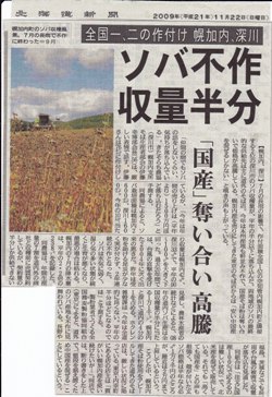 記事の内容は、蕎麦の不作を報じたものですが、日本一の蕎麦生産を誇るわが北海道、その産地の中でも最大の栽培面積を誇る幌加内町・深川市で収量が半分以下だったといいます。