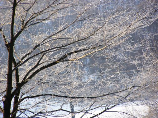 市街地を出ると、道端の木の枝は霧氷のように白く輝いていました。