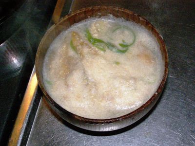 青大豆(なければ普通の大豆でも良い)を水に浸し一晩置いたものを、すりつぶすと「呉」ができます。この「呉」を野菜と一緒に味噌汁仕立てにしていただきます。