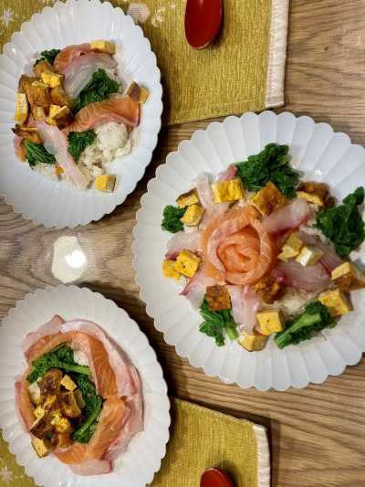 そして今晩はちらし寿司にしました。それぞれ盛り付けたら3者3様。