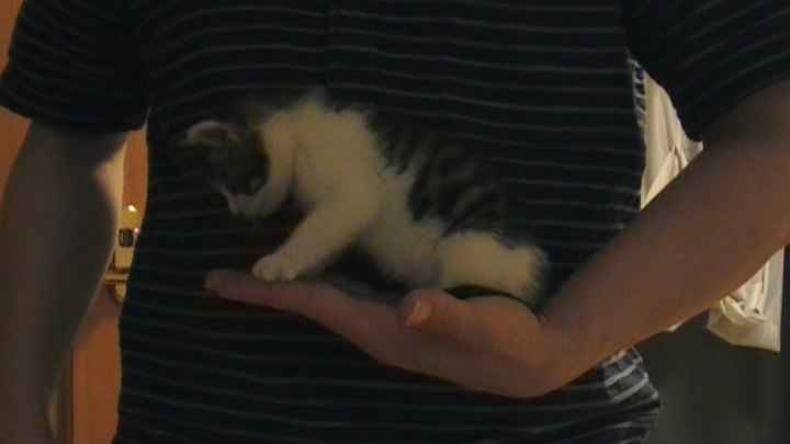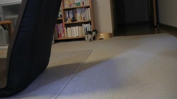桃子の散歩で子猫を拾ってきました。まだまだ暑いので桃子の夜の散歩は21時過ぎです。いつものように奥さんが桃子を連れて散歩に来ました。出てすぐに電話がかかってきましたなにごとだろう子猫がフェンスのところに居て泣いている桃子も動かないし、助けてあげたいから来てというのです。作業中断していってみると、もう子猫を抱きあがていました。子猫はすごい勢いで泣いているし、桃子は興奮して飛びつこうとしているし。近所の人の話では朝からずっとその子猫は一匹でいて泣き続けていたそうです。家を出て一分いくかどうかの場所です。桃子は子猫が気になって仕方ない様子危ないからと引き離されているので、気になって興奮してしまっています。くらい中様子を見ると、左目があきません。体もかなり汚れきっていて、野良猫に間違いないようです。やっと歩き回れるようになり、親からはぐれたのでしょう。一日中泣いていても連れに来ないということは、時間的にももう親猫が来ることはなさそうです。何より雨が降りかけていて、このままでは命が危ないです。子猫の年齢は疎いのですが、ちょうど手のひらサイズ。軽く桃子に散歩をさせ急いで家に戻りました。明るいところで見ると、体中蚤のフンだらけ。毛にこびりついていて取れません。桃子は嫌がるかと心配しましたが、その様子もなく受け入れてくれました。なめてあげようとするのですが、初めのうちは子猫も警戒。外では、猫特有の威嚇音まで出していましたが、すぐ落ち着いてくれました。少し落ち着かせ、少量の温めた牛乳をストローで飲ませ落ち着いたところで桃子用の薬用ヨードシャンプーで洗いました。すさまじい量のノミ50匹は超えているでしょう十数匹ずつ取れるごとに水を変えること数回あまり泣くので全部取るのはあきらめてタオルで拭き取りドライヤーで乾燥乾いてくると落ち着きました。その間、シャンプー大嫌いな桃子も心配そうに足元でうずくまったり伸びあがって様子をうかがったり。いつもなら近づきもしないのに。左目が完全につぶれていて、治療も無理かなと心配しましたが洗ってあげたらぱっちり開きました。明日は桃子がかかりつけの獣医さんに行き健康診断と蚤の処理をしてもらいます。まだ小さいから不妊手術はどうなんでしょう。治療して元気になったら貰い手が見つかると良いのですがマンションは規約で動物は二頭まで。ぎりぎり飼ってあげられるので、もらい手が見つからないときは桃子の子分として「小梅」ちゃんとなって生活してもらいます。生後数週間程度でしょうから、15年以上これから面倒みることになります。できれば、里親が見つかるとありがたいですが。今、雨脚が強まっています。ゲリラ豪雨をさんざん経験したので、驚きませんがこの雨では子猫放置しなくて良かったと、決定に安心できました。野良でも、親と一緒の方が良いと思うんです。でも、このままじゃ助からないし。温めた牛乳を少しずつ飲ませ、午前一時すぎ、何度目かの牛乳を飲みやっとおしっこしてくれました。体もすっきりし、おなかも満足、出すものも出して・・・段ボール箱にタオルを敷いた即席ベッドそれまで嫌がってはい出していたのですが、タオルにくるまって寝てしまいました。これから1,2時間したら、またミルクの時間です。しばらくは2-3時間ごとの授乳早く離乳食になってほしいけれど、ストローから牛乳飲む姿は可愛くて、2-3時間ごとにあげるのも良いかなという気にもなります。3回目くらいでストローから飲めるようになったのにはびっくり。新しいことになれるのが早い。環境適応力抜群です。子猫事件で作業予定はすっかり狂いましたがこういうハプニング、たまには良いものです。桃子も4ヶ月で処分されそうだったペットショップから引き取りました。この子猫も、拾われる運命だったのかもしれません。小梅として生きるのか、よそでかわいがられるのかまだ分かりません。先日買ったEverio(ビクターのビデオカメラ)大活躍買ったばかりのロングバッテリーも大活躍来たばかりの子猫の姿を撮影させてもらいました