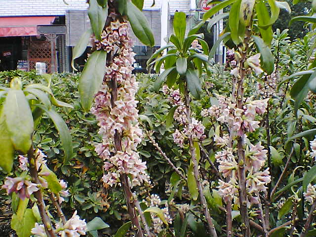 ちょっとみると沈丁花に似ているので日当たりが悪くて開花が遅れているのかと思っていましたが香りが漂っていません。近寄ってよく見るとまったく違う咲き方。沈丁花は枝の先端に花をつけますが幹の周りに花をつけています。珍しい咲き方。華やかな花では無いし葉に隠れてしまった見えにくいのですが、今を盛りと咲き誇っています。