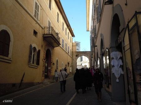 ポルティカ通りから、込んでるサン・フランチェスコ通りを避けてジョット通り。有名人なのに、通りがすっごく短いわ。このピッツェリアがおいしいんだって。こっちの階段とか、あっちの坂とか、ちょっと行ってみたりしてもしたいわね。昔の修道院か何か? 今は何だろ。景色もきれいで、シクラメンもきれい。通りの名前は、ベッラ・フォンターナ。 きれいな噴水通り。噴水はどこかな?#アッシジ