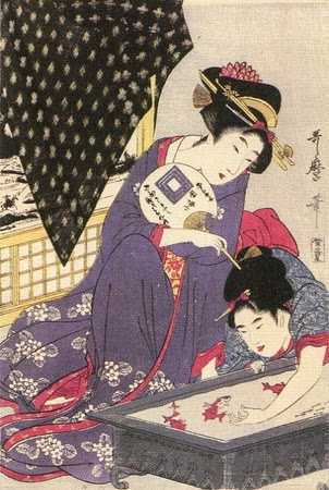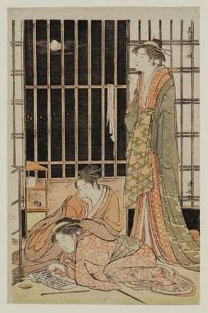 品川の遊所で、秋の夜長をくつろぐ美人と、お月さまぼんやり眺める美女。