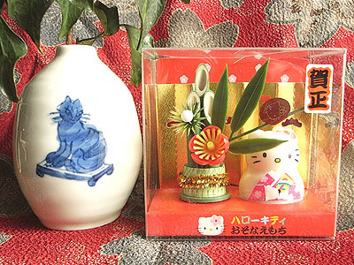 年末年始の勤務スケジュール、31日まで3連休をいただいて、元旦、2日と仕事でした。"年の暮れ" はそこはかとなく感じて過ごしましたが、"お正月" は、同僚ナースや患者さんと「明けましておめでとうございます。」と挨拶を交わす中でプチ感じたくらいでした。1日、患者さんの朝食にはお雑煮が付いていました。朝食の時ラウンドしていると患者さんが、「看護婦さんはお雑煮食べましたか?」と尋ねてこられたんですが・・・食べてませーん。(^_^)ゞ3日はオフ、そしてこのまま日常へ突入。お雑煮もお節もなしのお正月。やーですねーひとりもんは(笑)。部屋の中もお正月テイストは皆無なのですが、"猫グッズコレクション" の中から、こんなモノをひっぱり出してみました。遥か昔に年の瀬のスーパーマーケットで見つけてゲットした、ハローキティの鏡餅飾りです。隣りの一輪挿しも、"猫グッズコレクション" のひとつ。キティちゃんの中にお餅が入ってるんですが、未開封。賞味期限は2001年3月31日。「2001」の「1」を「7」と書き換えて偽称してみたとしても、もはや鏡開きはムリですね。(^_^)ゞ