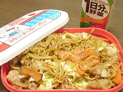 「最近、塩焼きそばが結構お気に入り。」と書いたのは9月25日。それ以来、左横に貼っている「Recommend Item」に「塩焼きそば」がちょくちょく登場してます。書いてから既に3ヶ月以上経った今もなお。塩焼きそばも確かに好きですが、ソース焼きそばも私は好きです。(^_^)ゞ【ソース焼きそば】具はオーソドックスにキャベツ、人参、玉葱、豚肉。勤務スケジュールの関係で、ご飯を炊くと都合が悪い。なのでこーんなお弁当。スーパーで売っている、ソース付きの冷蔵麺を買ってきて作りました。ソースは液体より粉末タイプのモノの方が好きです。↓業務用 冷凍焼きそば「おたふくソース」使用で「関西風の懐かしい味わい」なんやて。「湯煎で8分」らしいけど、イラチな人は「レンジでチン」やんな★