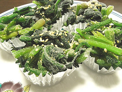 「きんぴらごぼう」に続く第2弾。snowkid謹製 冷凍おかず「ほうれん草の胡麻和え」アルミカップに小分けして冷凍しました。お弁当箱には凍ったまま入れておくと、お昼どきには丁度食べ頃。味も落ちてません。胡麻はすって和えますが、お弁当用に見栄え良く、すらない胡麻もトッピングしてみました。ほうれん草が安いときにまとめて作っておくと、安く無駄なく、お弁当のおかずを考える手間もひとつ減るという寸法。ところで、この胡麻和えは私の手作り。国産の食材あーんど調味料使用です。残留農薬については未調査ですが、意図的には入れてません。これは確か。ゆうべ、市販の冷凍餃子を食べた人が食中毒になり、意識不明の重体者も出たというニュースが流れました。冷凍餃子は中国の工場で製造された商品で、餃子とパッケージの一部から有機リン系農薬「メタミドホス」(日本では不認可)が検出されたとのこと。また、残留農薬にしては量が大量で、製造過程での混入、意図的な混入、などの線でも調査中であり、同工場の商品の自主回収が行われているようです。私はお弁当のおかずに冷凍食品も使います。お気に入りの商品があって、買うのはいつも同じモノばっかりですが、今回のニュースにはホントびっくりです。食材の産地や製造元も比較的選んで買う方ではあるのですが、今回問題となった商品や自主回収の対象になった商品に原産国の明記はあったのかな? あったとしても、見逃して買ってしまう可能性も否定できない。恐い恐い。「手作り冷凍おかず」には "安く無駄なく便利" なだけでなく、 "安心・安全" というメリットもあったのだなーと、今回のニュースで気付きました。「お弁当にフライ物をちょこっと。」という感じで冷凍食品に頼ってきましたが、手作りして凍らせてみよっかなーと思ってみる今日この頃。