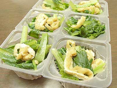 先日、お弁当用冷凍おかずをちょとスマートに作る・・・てな話を書きました。何のコトはない、市販の冷凍食品が入っていたプラスチックトレイを利用して形よく凍らせるというだけのコトなんですが、コレがもくろみ通り、結構よござんした。(^_^)ゞで、また使ってみました。【snowkid的お弁当用冷凍おかず「小松菜の煮びたし」】小松菜と油揚げを煮びたしにしました。こんな風に汁のあるおかずは、トレイを使って凍らせると便利です。だもんで、トレイはまた洗って取っとこうと思います。本来ならすぐゴミになってしまうトレイ。洗って繰り返し使うコトで、ちょとしたエコにもつながるってモンです。【楽天市場で材料揃えて Let's Cooking♪】京都産の小松菜どすえ♪京都のお揚げもどうどす♪作ンの面倒やったら出来合いのんこうとく?