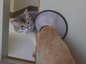 <写真は前日(5日)にシャンプー後のちわ君を見て「あんた誰??」といっているむくちゃんと、カラーが引っかかってうまく身動きできないちわ君>