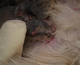 お乳は相変わらず下の二つからしか出ていないようなので、病院の看護婦さんに一匹ずつ授乳してもらった。体重はそれぞれ96.1g/95.9g/88.7g/68.5gになった。