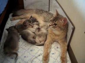 多分、仔猫たちが歩けるようになってきたので、ベットから落ちるのが心配だったのだと思います。その2~3日前に、私が同じ場所へ仔猫とケースを移動したときには、嫌がってベッドの上へ仔猫を咥えて行ったのですが、少し大きくなった今は、確かにこちらのほうが安全です。むくちゃんなりに、仔猫たちの成長に合わせ、その時々で最善の場所を考えているみたいです。