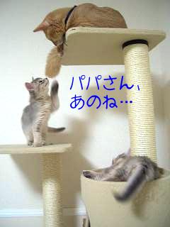 仔猫たちのほうは、パパを覚えていてのことか、単なる好奇心か、ちわ君の側に行きたがるのですが、ちわ君のほうは明らかに嫌がって逃げ回っていました。